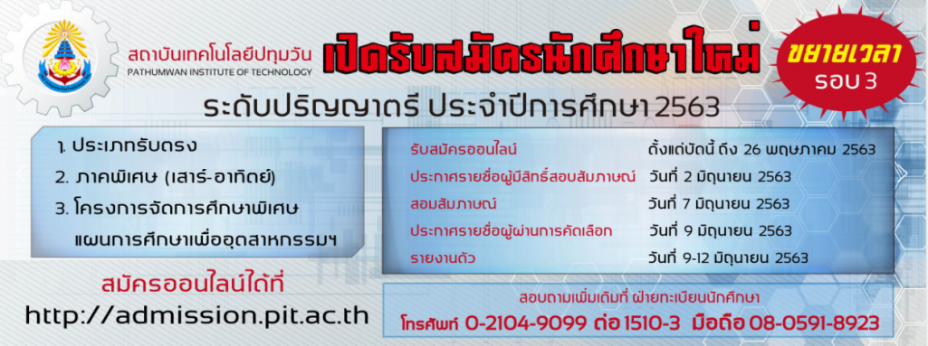 สถาบันเทคโนโลยีปทุมวันเปิดรับสมัครนักศึกษาใหม่ ประจำปีการศึกษา 2563 (รอบ 3) Posted on May 10, 2020May 22, 2020 by admin_Hattaphan สถาบันเทคโนโลยีปทุมวันเปิดรับสมัครนักศึกษาใหม่ ประจำปีการศึกษา 2563 (รอบ 3) ตั้งแต่บัดนี้จนถึงวันที่ 26 พฤษภาคม 2563 กดดูข้อมูลเพิ่มเติม Post Views: 977