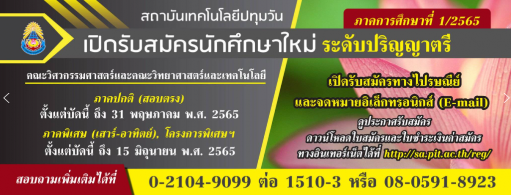 สถาบันเทคโนโลยีปทุมวัน เปิดรับสมัครนักศึกษาใหม่ ปีการศึกษา 1/2565 Posted on February 11, 2022 by admin_Hattaphan สถาบันเทคโนโลยีปทุมวัน เปิดรับสมัครนักศึกษาใหม่ ปีการศึกษา 1/2565 รายละเอียดเพิ่มเติม (ฝ่ายทะเบียนนักศึกษา) รายละเอียดเพิ่มเติม (ประกาศรับสมัคร) Post Views: 655
